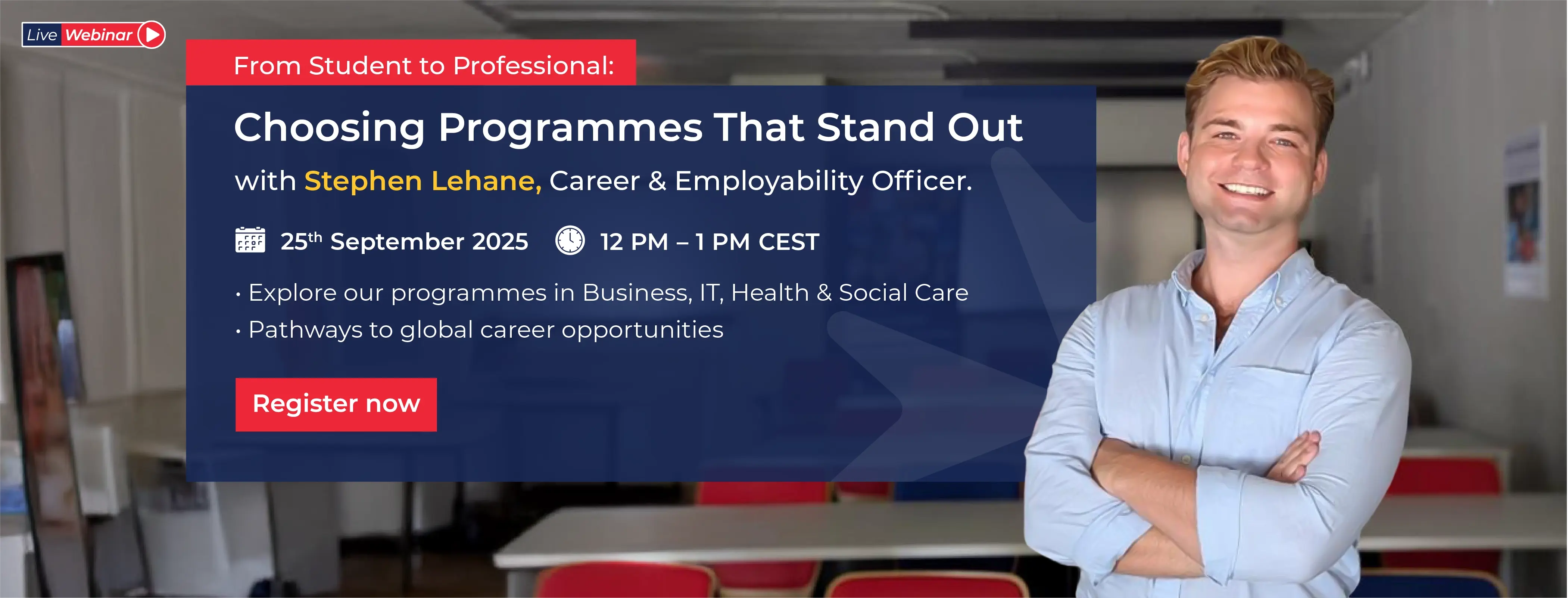 Are you ready to turn your studies into a career that stands out? Join us for an interactive session with Stephen Lehane, Career & Employability Officer, as we explore how choosing the right higher education program can open doors to exciting career opportunities.